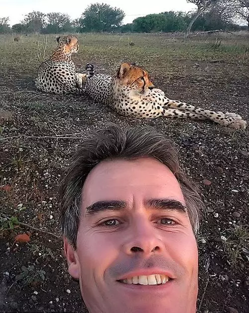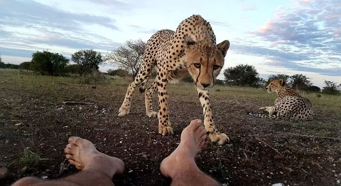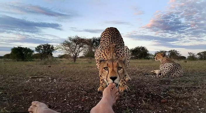 有攝影師在非洲光著腳近距離拍攝野生獵豹,沒想到有「大貓」好奇上前輕舔他的腳趾,讓他喜出望外。