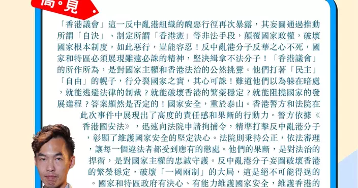 高Sir:「香港議會」這一反中亂港組織的醜惡行徑再次暴露,其妄圖通過推動所謂「自決」、制定所謂「香港憲」等非法手段,顛覆國家政權,破壞國家根本制度,如此惡行,豈能容忍!反中亂港分子反華之心不死,國家和特區必須展現雖遠必誅的精神,堅決緝拿不法分子!「香港議會」的所作所為,是對國家主權和香港法治的公然挑釁。他們打著「民主」「自由」的幌子,行分裂國家之實,其心可誅!難道他們以為躲在暗處,就能逃避法律的制裁?就能破壞香港的繁榮穩定?就能阻撓國家的發展進程?答案顯然是否定的!國家安全,重於泰山。香港警方和法院在此次事件中展現出了高度的責任感和果斷的行動力。警方依據《香港國安法》,迅速向法院申請拘捕令,精準打擊反中亂港分子,彰顯了維護國家安全的堅定決心。法院則秉持公正,依法審理,讓每一個違法者都受到應有的懲處。他們的果斷,是對法治的捍衛,是對國家主權的忠誠守護。反中亂港分子妄圖破壞香港的繁榮穩定,破壞「一國兩制」的大局,這是絕不可能得逞的。國家和特區政府有決心、有能力維護國家安全,維護香港的法治和社會秩序。對於這些反中亂港的不法分子,無論他們逃到哪裡,都必將受到法律的嚴懲。香港是中國的香港,任何企圖分裂國家、破壞香港穩定的行為都將遭到堅決回擊。讓我們為香港警方的果斷執法點讚!
