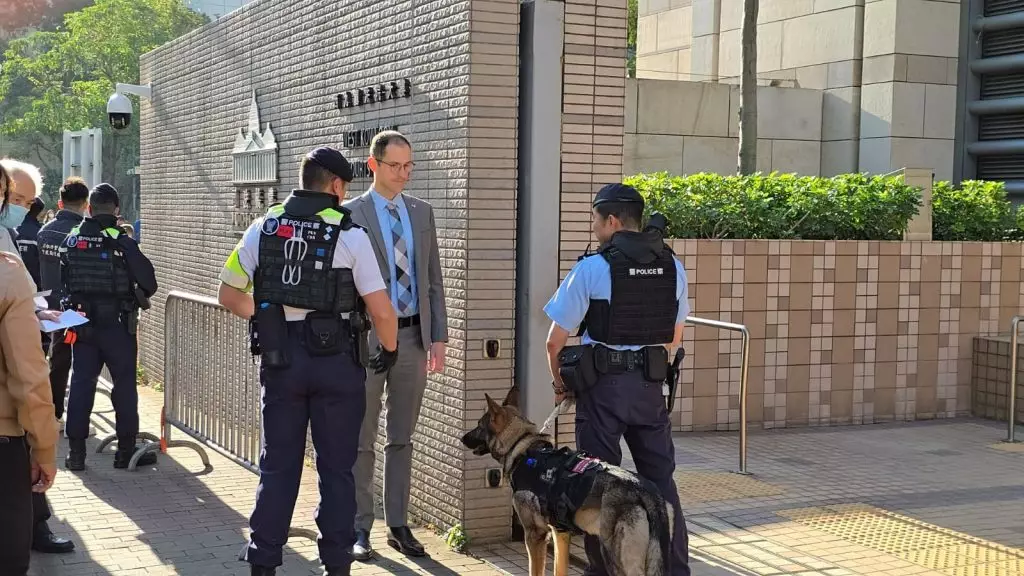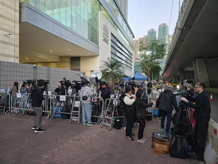 今早上7時許,載着黎智英的囚車已抵達西九龍法院,警方在法院一帶加強戒備, 多名警員在法院外駐守,出動「劍齒虎」裝甲車及多輛警車。在西九龍法院外,有過百人輪候入庭旁聽,包括多名外國駐港領事館職員。案件亦吸引大量中外傳媒採訪。黎智英的妻兒及天主教香港教區榮休主教陳日君樞機則於9時半一同到庭。