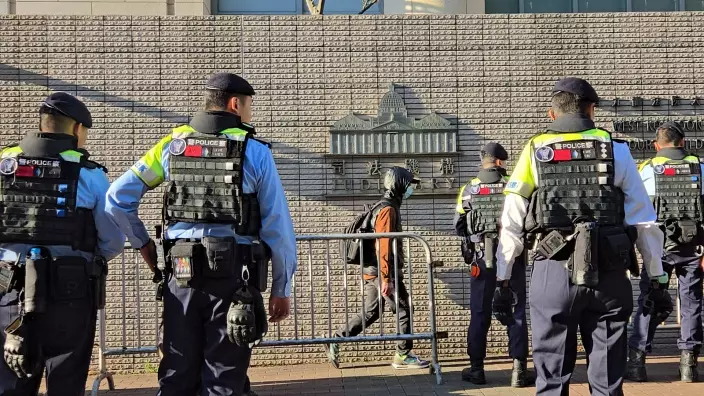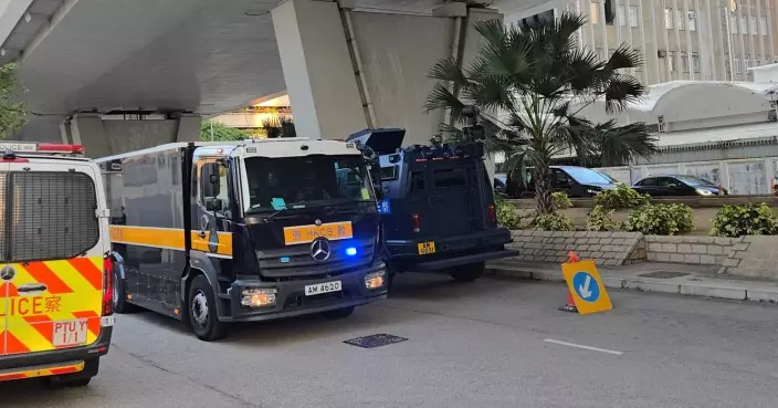 警方在法院一帶加強戒備, 多名警員在法院外駐守,出動「劍齒虎」裝甲車及多輛警車。巴士的報記者攝