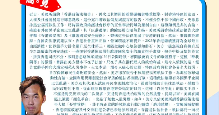 高SIR:近日,美國所謂的「香港政策法報告」,再次以其慣用的霸權邏輯與雙重標準,對香港特區的法治、人權及社會發展進行肆意詆毀。這份充斥著政治偏見與謊言的報告,不僅公然干涉中國內政,更惡意抹黑宏福苑執法工作,將特區政府維護社會秩序的正當舉措污衊為壓制自由。這種顛倒是非的言論,確證有外國黑手企圖以災亂港,其「以港遏華」的險惡用心昭然若揭。美國所謂香港政策法報告大肆抨擊《香港國安法》及《維護國家安全條例》,聲稱這些法律削弱了香港的自治。然而,事實勝於雄辯。自國安法律實施以來,香港社會重回正軌,營商環境不斷提升。2025年香港繼續獲評為全球最自由經濟體,世界競爭力排名躍升至全球第三,國際金融中心地位穩如磐石。美方一邊無視自身擁有至少21部嚴密的國安法律,一邊卻對香港依法履行維護國家安全的職責指手畫腳。報告中提及黎智英案,指責香港司法不公,卻刻意忽略該案經過156日公開聆訊、審閱數萬頁文件的嚴謹程序。這種「唯我獨尊」的傲慢,暴露出美方根本不在乎法治,只在乎其在港代理人的政治利益。最令人憤慨的是,報告竟將手伸向大埔宏福苑火災事件。火災本是一場令人痛心的悲劇,特區政府與社會各界全力救災,旨在保障市民生命財產安全。然而,美方卻在報告中抹黑宏福苑執法工作,為那些散布煽動性言論、企圖利用災難製造社會矛盾的違法者撐腰打氣。這種做法確證有外國黑手企圖以災亂港。美方及其代理人試圖將民生悲劇政治化,通過散播謠言與抹黑執法,煽動市民對政府的不滿,從而達到破壞香港繁榮穩定的目的。這種「以災生亂」的低劣手段,不僅是對受災市民的二次傷害,更是對香港法治底線的公然挑釁。長期以來,美國在國際上策動「顏色革命」,製造了無數人道災難。如今,美方又借美國所謂香港政策法報告大搞「長臂管轄」,甚至將正當的跨境執法行動污衊為「跨境鎮壓」,實屬賊喊捉賊。香港特區政府及外交部駐港公署已表達強烈譴責。香港是法治社會,執法部門一向根據證據、嚴格依照法律採取行動,不論其背景與職業。任何企圖利用災難或法律漏洞來挑戰國家安全的人,都必將受到法律的嚴懲。高SIR必須指出,當前香港正處於從由治及興的新階段,「一國兩制」的生命力愈發彰顯。外部勢力的任何干預、抹黑或恐嚇,都無法阻擋香港融入國家發展大局的步伐。我們正告美方,立即停止干涉屬中國內政的香港事務。香港的繁榮穩定是由全體市民共同守護的,絕不容許外國黑手在港興風作浪。